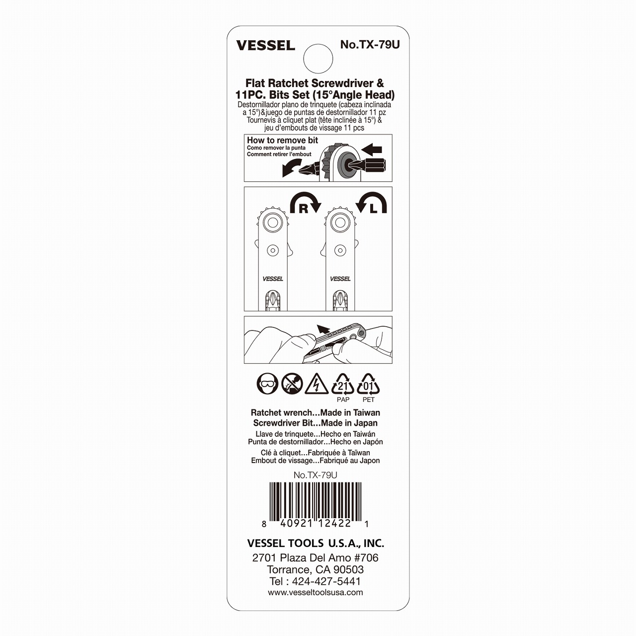 * Flat shaped ratchet screwdriver (bent-up type) * Bits +1, +2, +3, SL4, SL6, H3, H4, H5 ,T20, T25, T30x 18mm * Bit holder