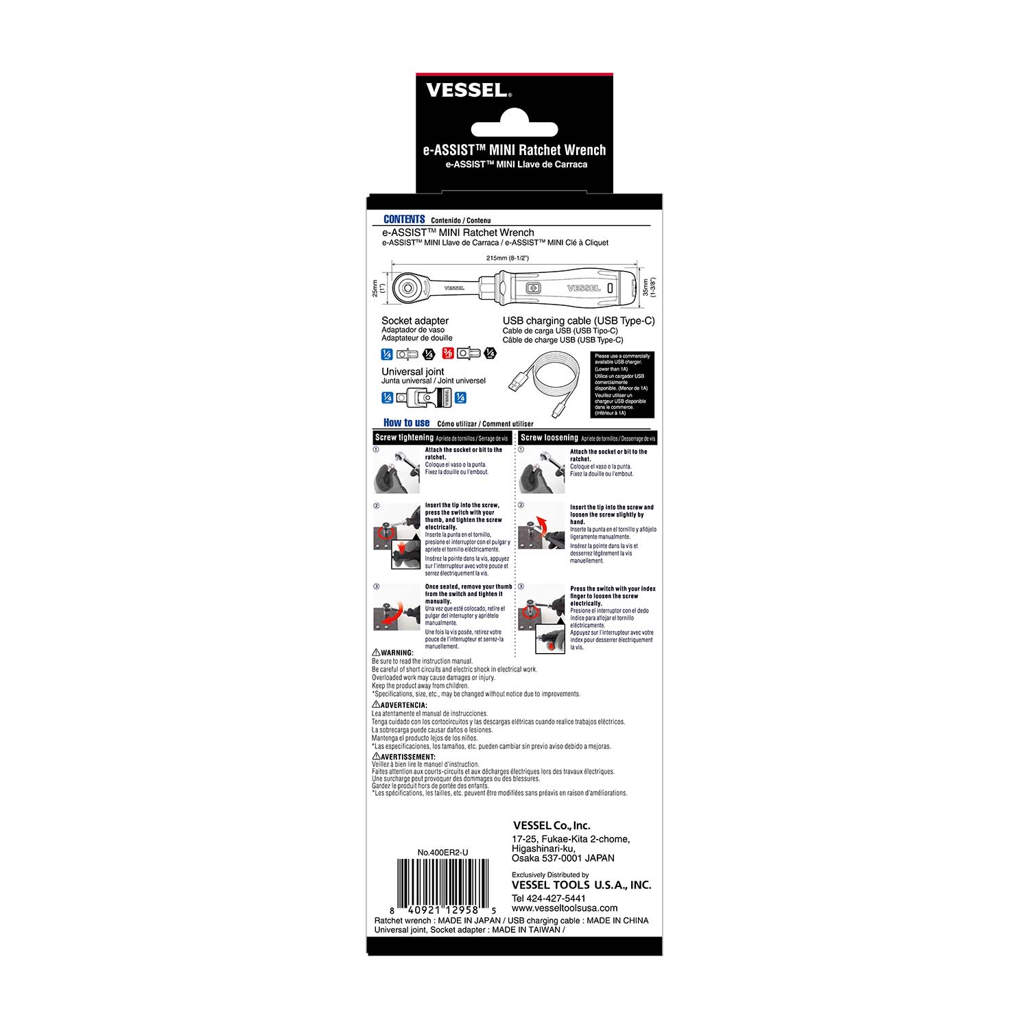 *e-ASSIST MINI Ratchet Wrench x1pc *included 1/4" & 3/8" Socket Adapter x 1pc *1 Universal Joint x 1pc *USB Charging Cable (USB Type C) (1m) x 1pc